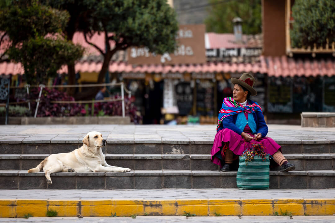 Street Dog with Vendor – Ollantaytambo, Peru